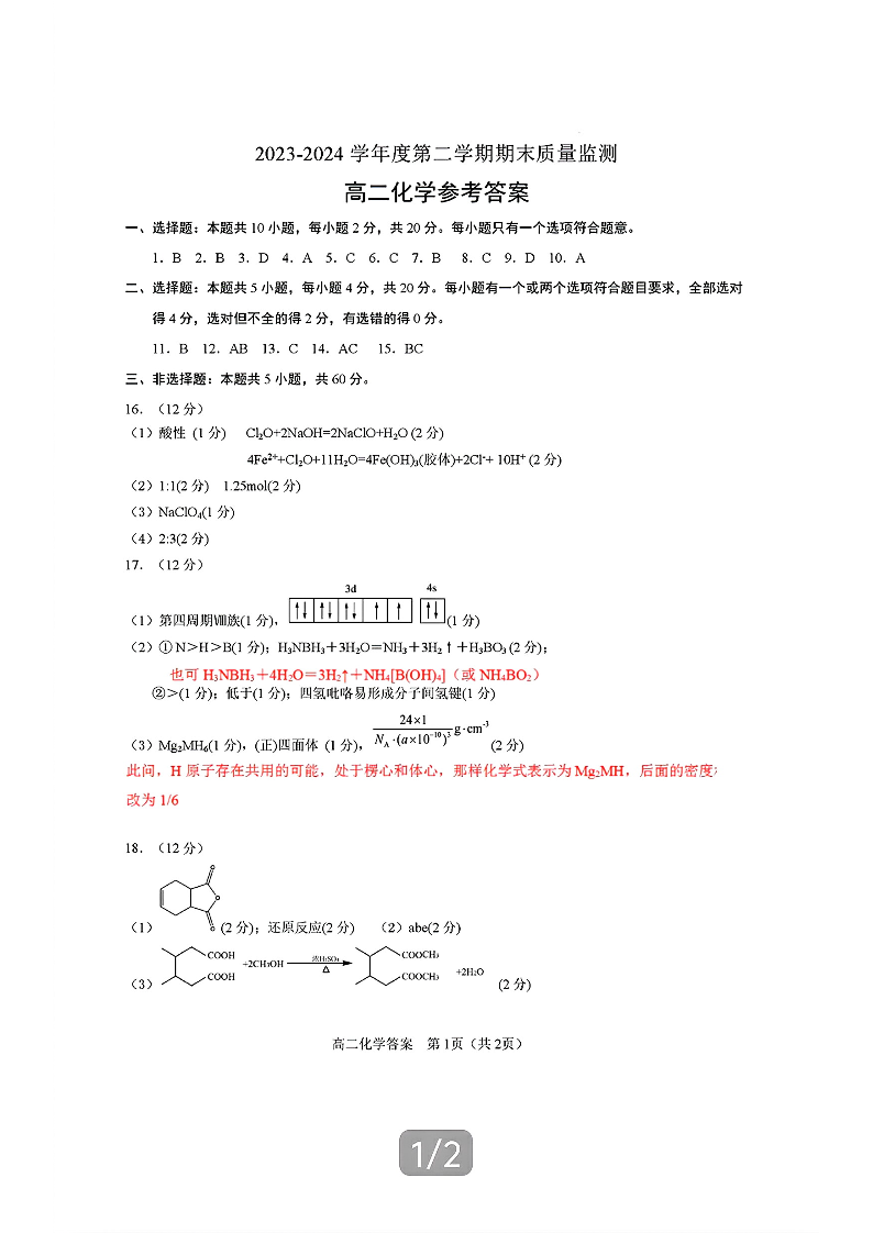 山东省东营市2023-2024学年度第二学期期末质量监测 化学答案