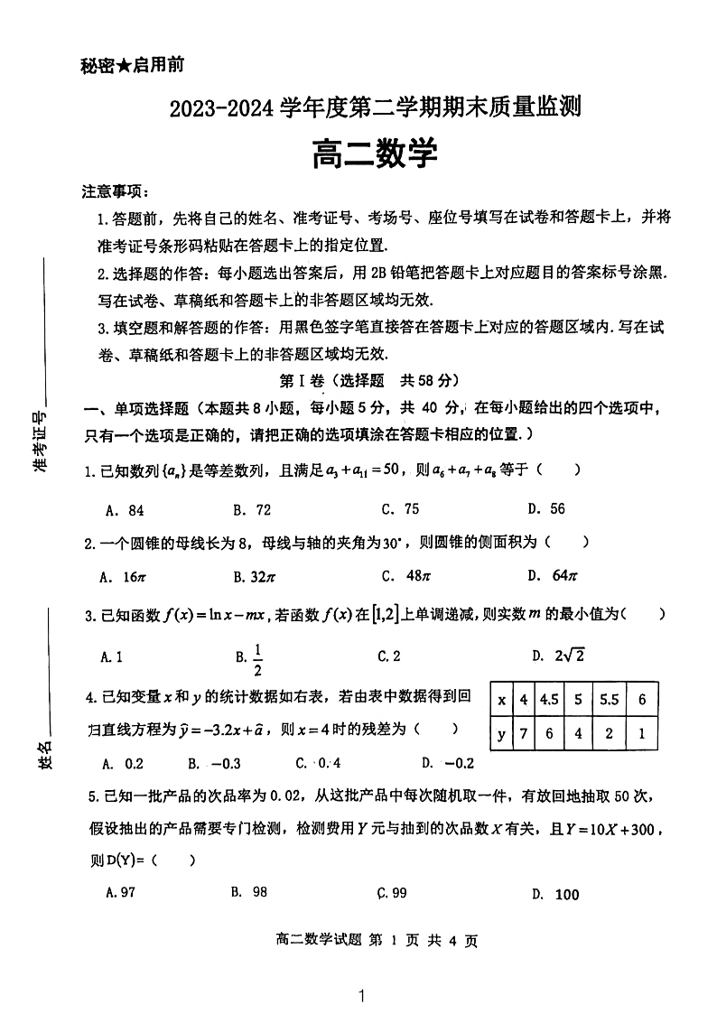 山东省东营市2023-2024学年度第二学期期末质量监测 数学