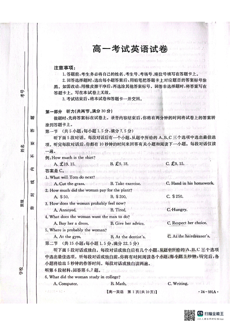 辽宁省辽阳市2023-2024学年高一下学期期末考试 英语