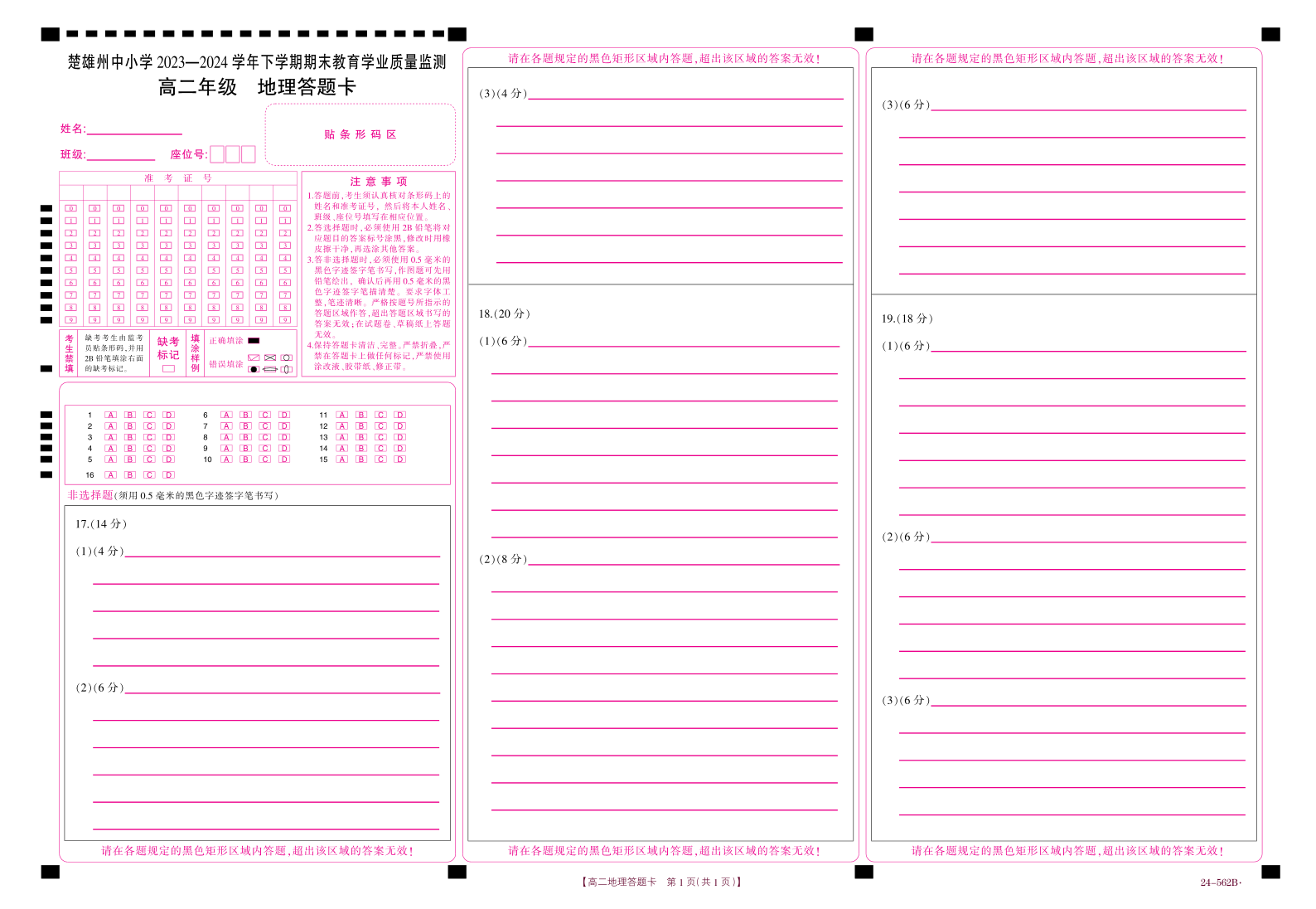 云南省楚雄州2023-2024学年下学期期末教育学业质量监测高中二年级 地理答题卡