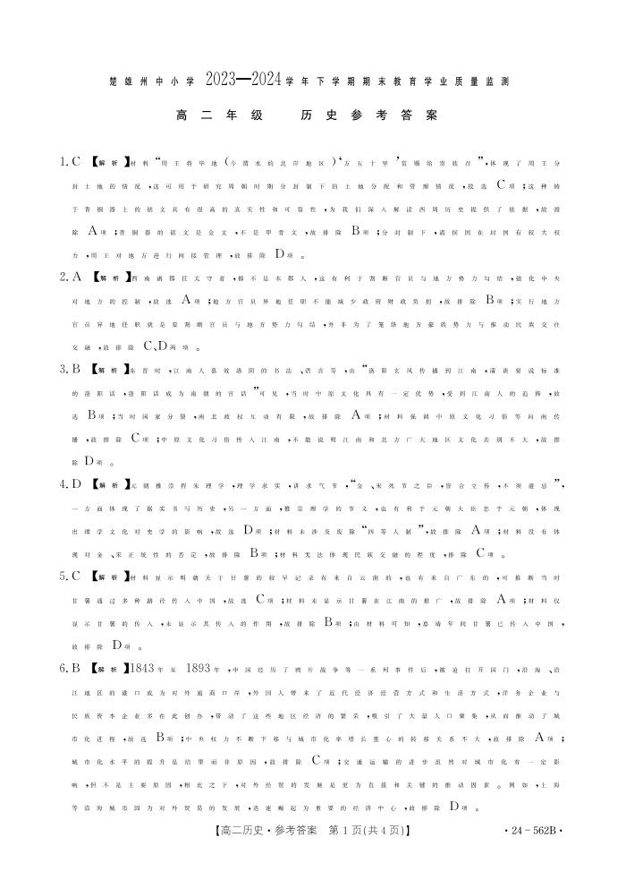 云南省楚雄州2023-2024学年下学期期末教育学业质量监测高中二年级 历史参考答案