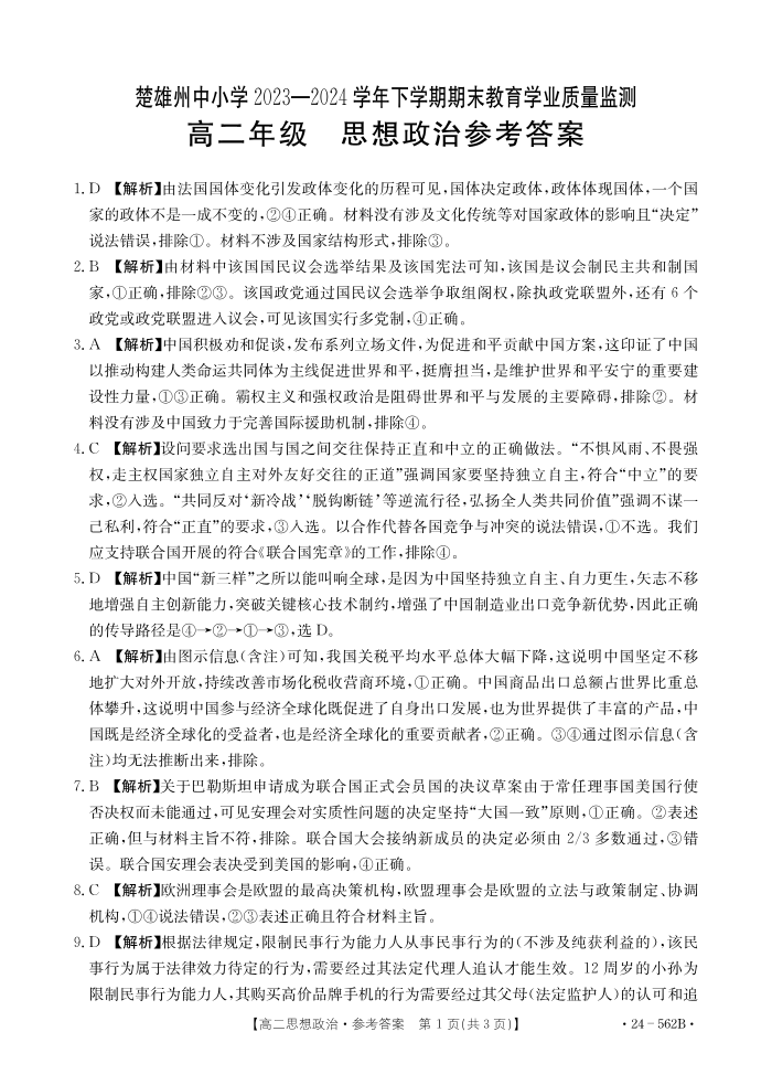 云南省楚雄州2023-2024学年下学期期末教育学业质量监测高中二年级 政治参考答案