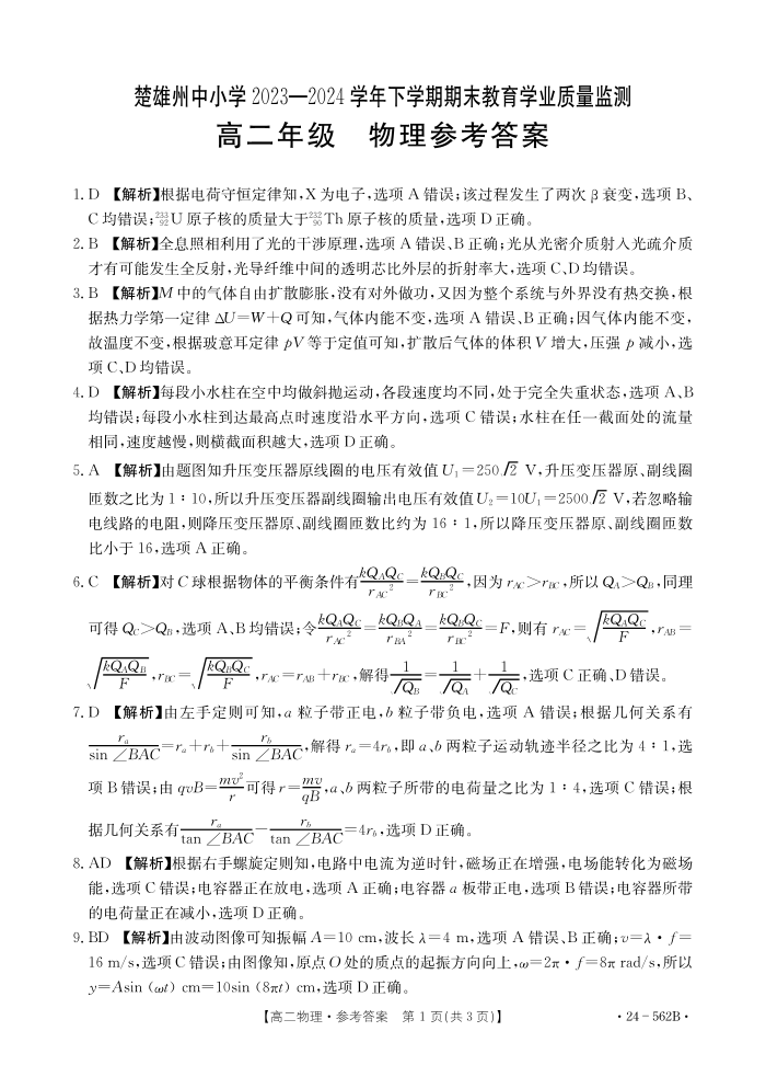 云南省楚雄州2023-2024学年下学期期末教育学业质量监测高中二年级 物理参考答案