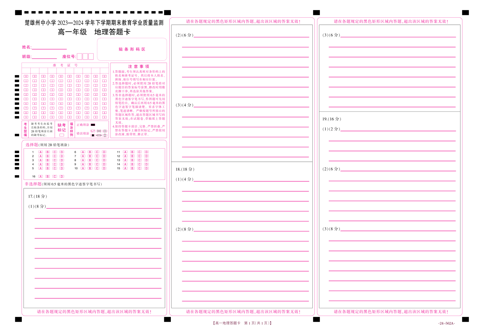 云南省楚雄州2023-2024学年下学期期末教育学业质量监测高中一年级 地理答题卡