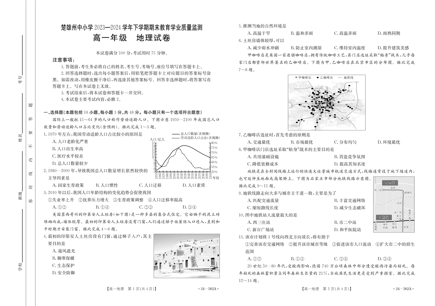 云南省楚雄州2023-2024学年下学期期末教育学业质量监测高中一年级 地理