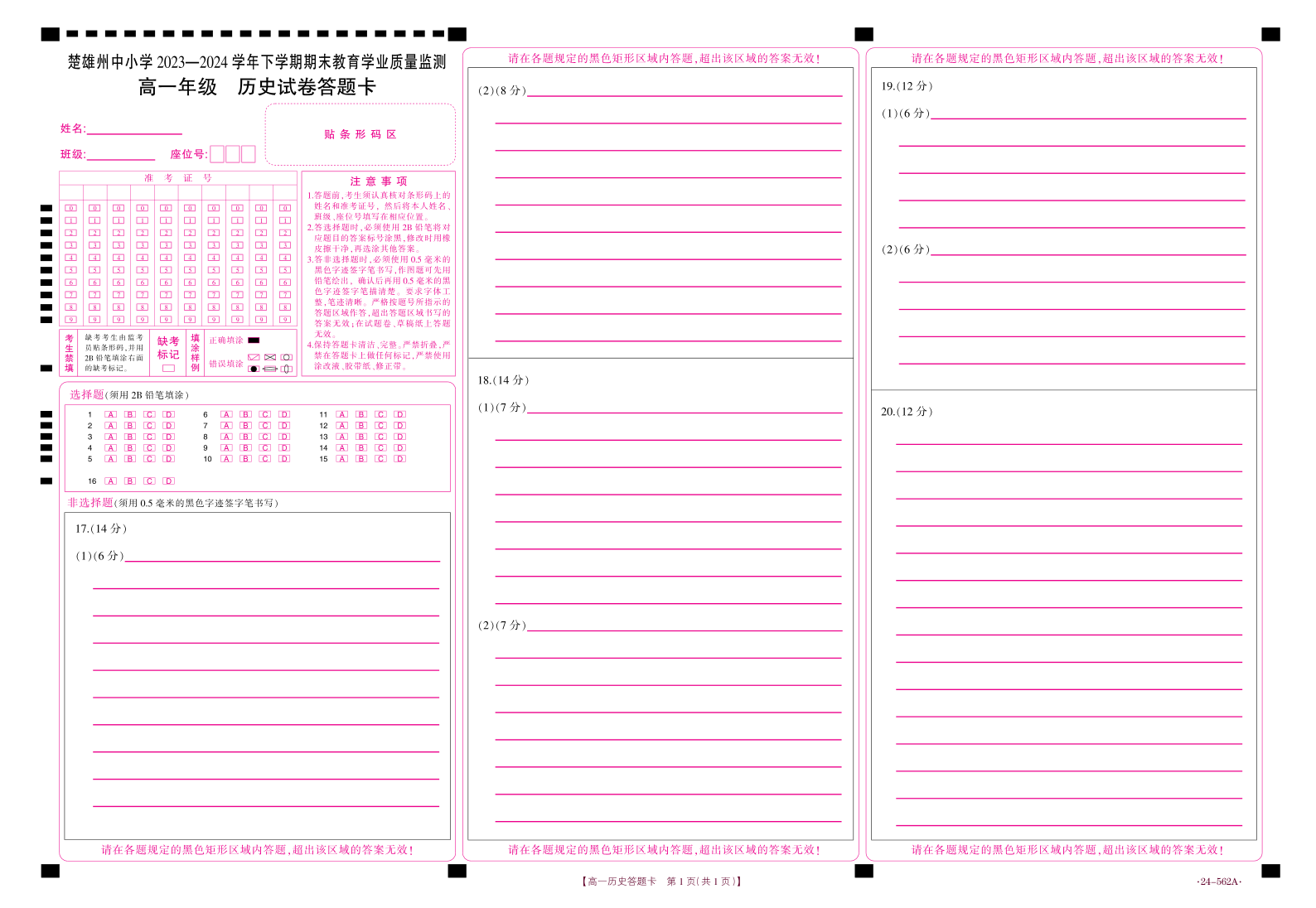 云南省楚雄州2023-2024学年下学期期末教育学业质量监测高中一年级 历史答题卡