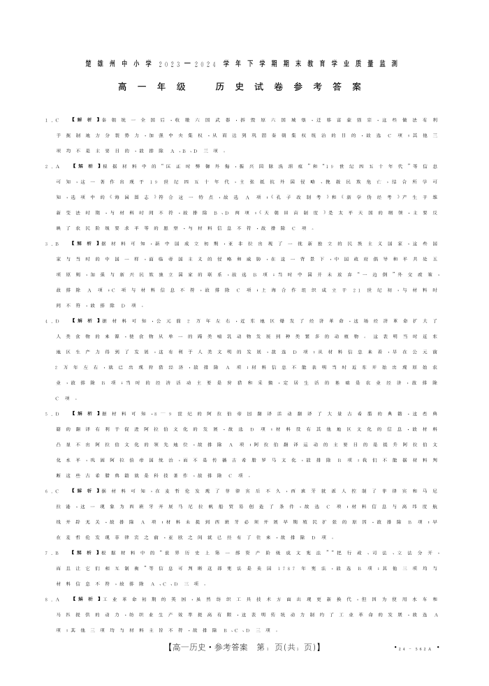 云南省楚雄州2023-2024学年下学期期末教育学业质量监测高中一年级 历史参考答案
