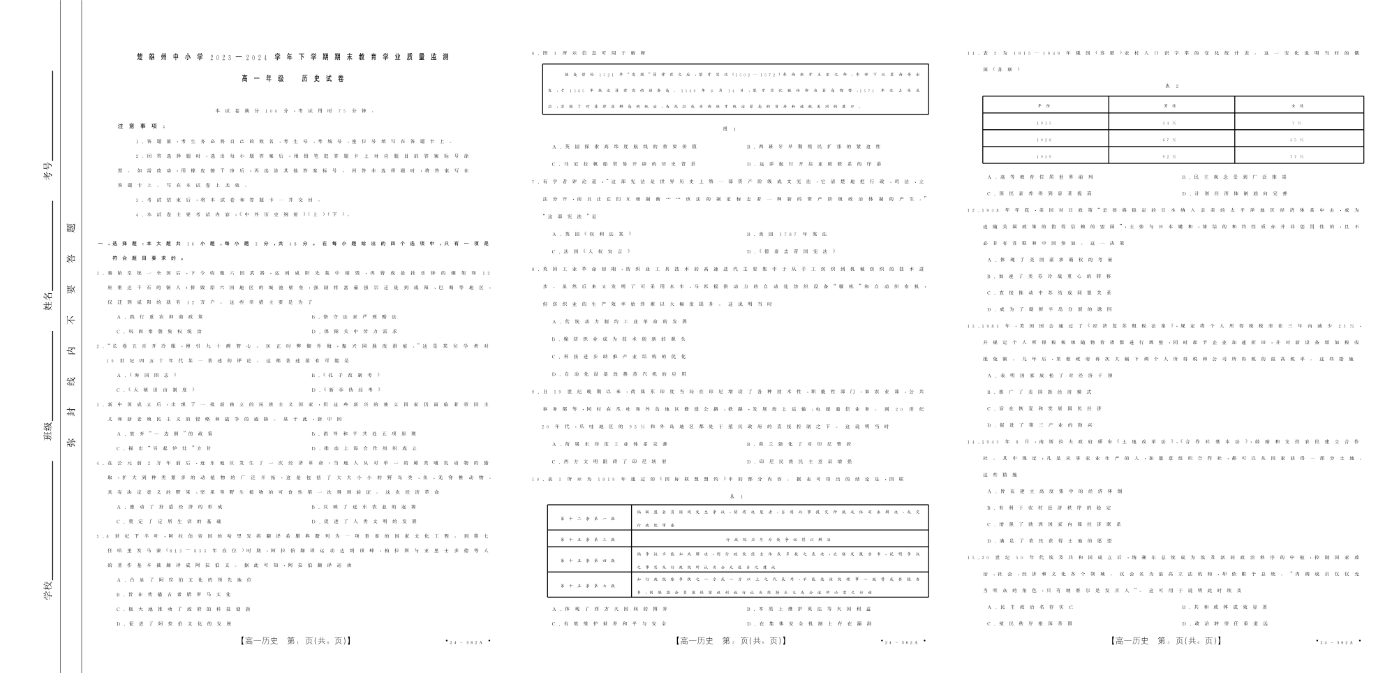 云南省楚雄州2023-2024学年下学期期末教育学业质量监测高中一年级 历史