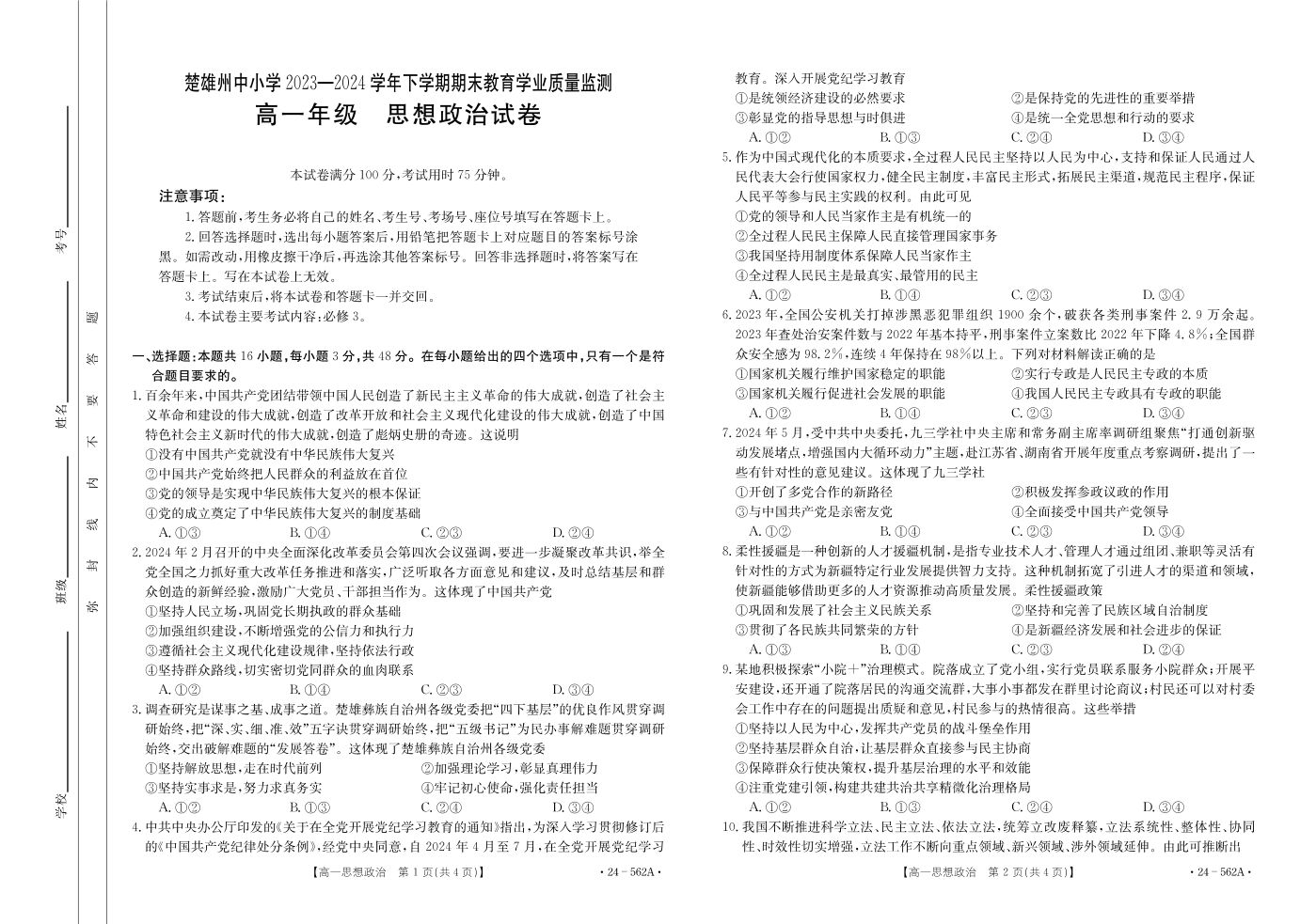 云南省楚雄州2023-2024学年下学期期末教育学业质量监测高中一年级 政治