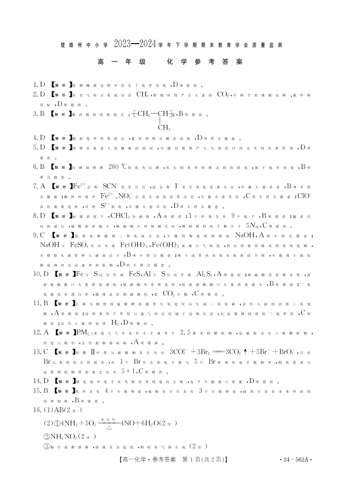 云南省楚雄州2023-2024学年下学期期末教育学业质量监测高中一年级 化学参考答案