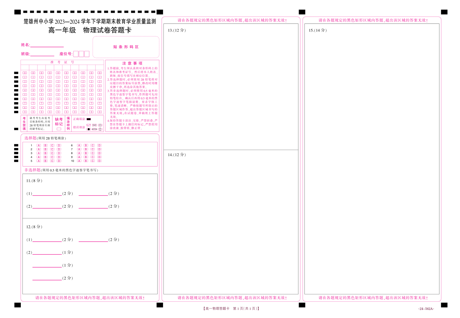 云南省楚雄州2023-2024学年下学期期末教育学业质量监测高中一年级 物理答题卡