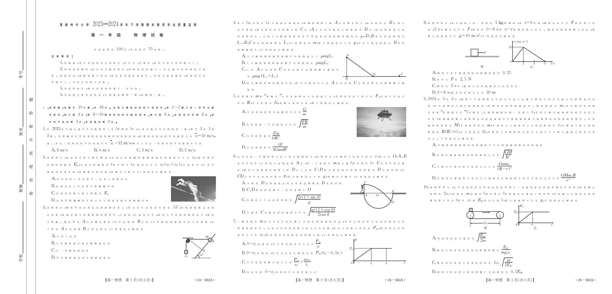 云南省楚雄州2023-2024学年下学期期末教育学业质量监测高中一年级 物理