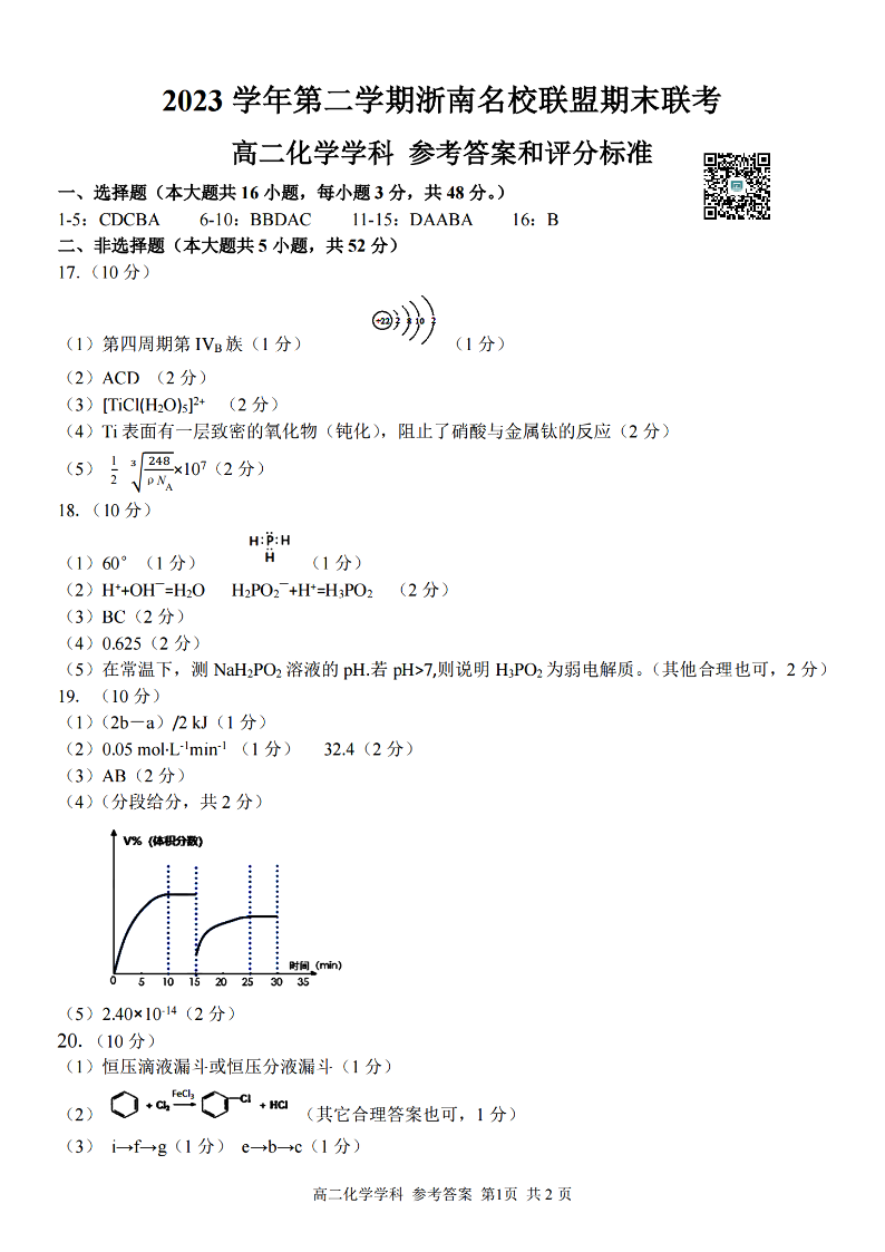 浙南名校联盟2023学年高二第二学期期末联考 化学答案