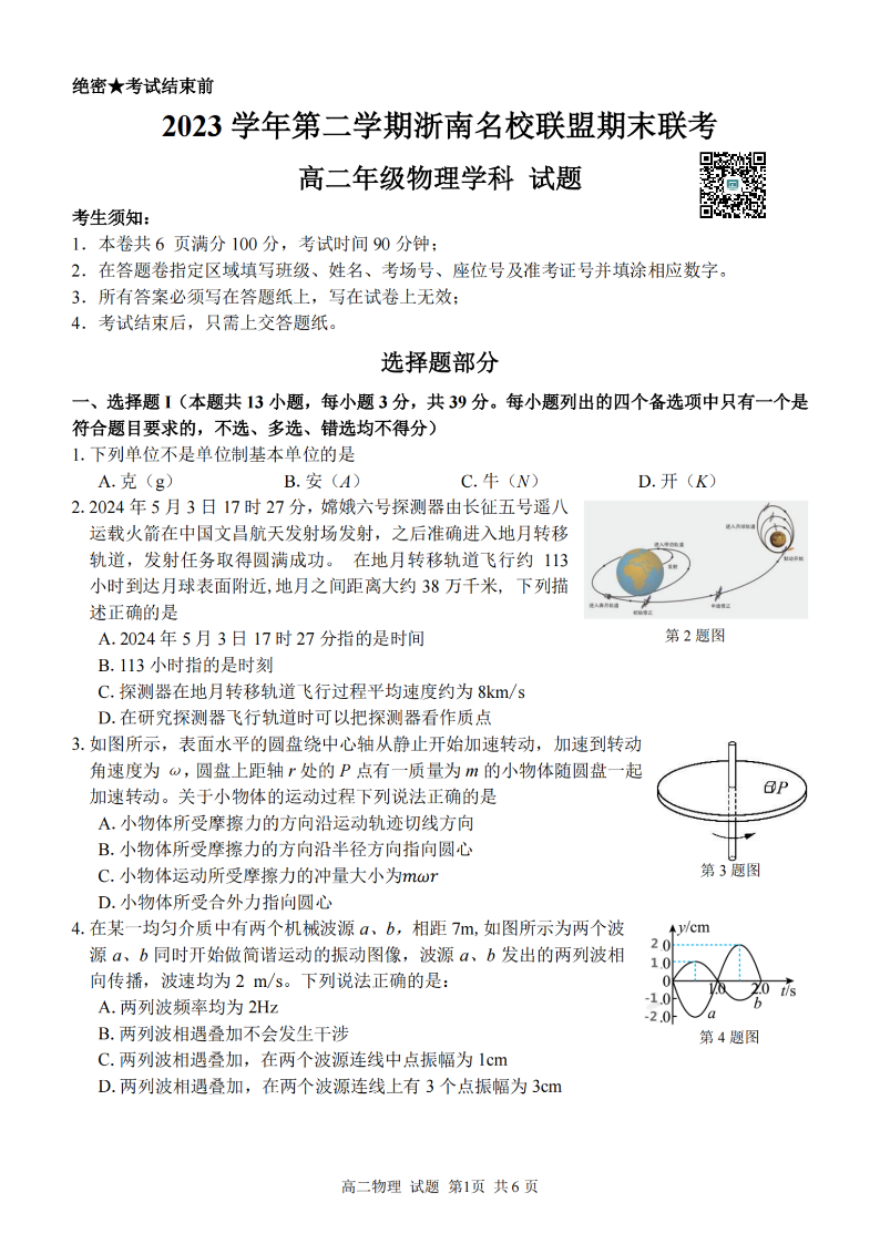 浙南名校联盟2023学年高二第二学期期末联考 物理
