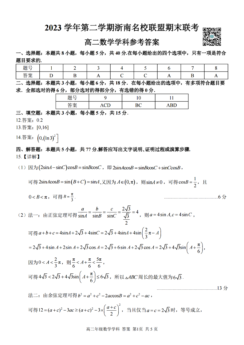 浙南名校联盟2023学年高二第二学期期末联考 数学答案