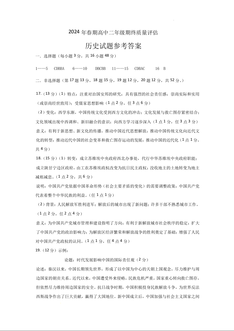 河南省南阳市2023-2024学年高二下学期期终质量评估 历史答案