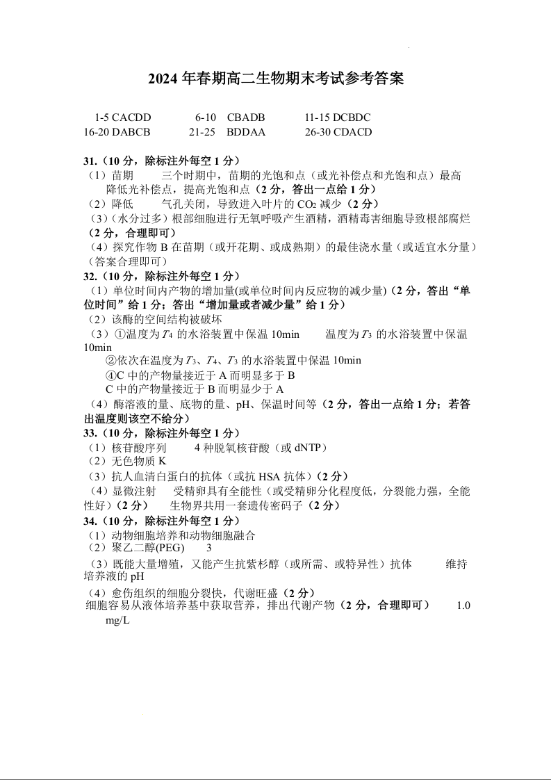 河南省南阳市2023-2024学年高二下学期期终质量评估 生物答案