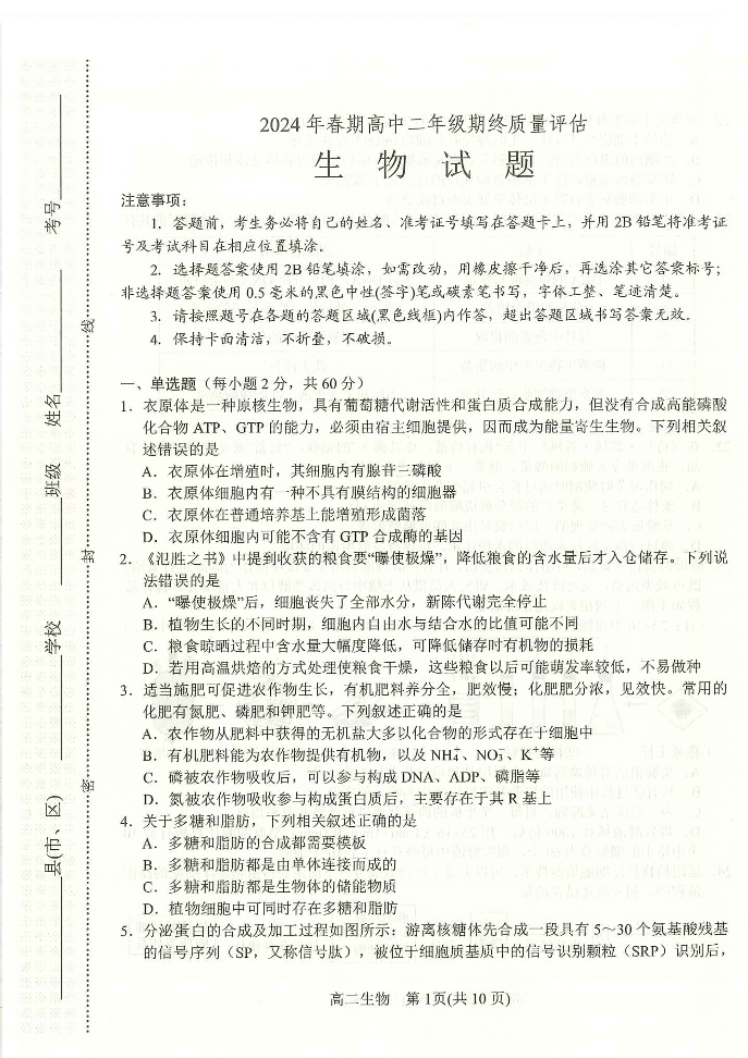 河南省南阳市2023-2024学年高二下学期期终质量评估 生物
