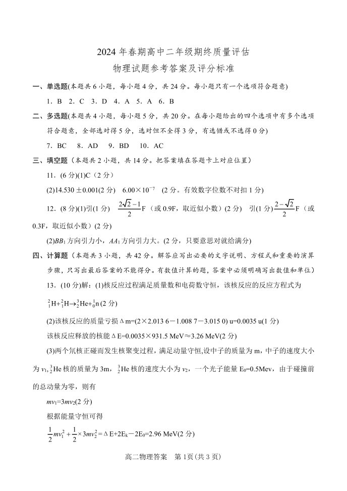 河南省南阳市2023-2024学年高二下学期期终质量评估 物理答案