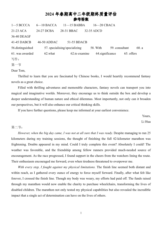 河南省南阳市2023-2024学年高二下学期期终质量评估 英语答案