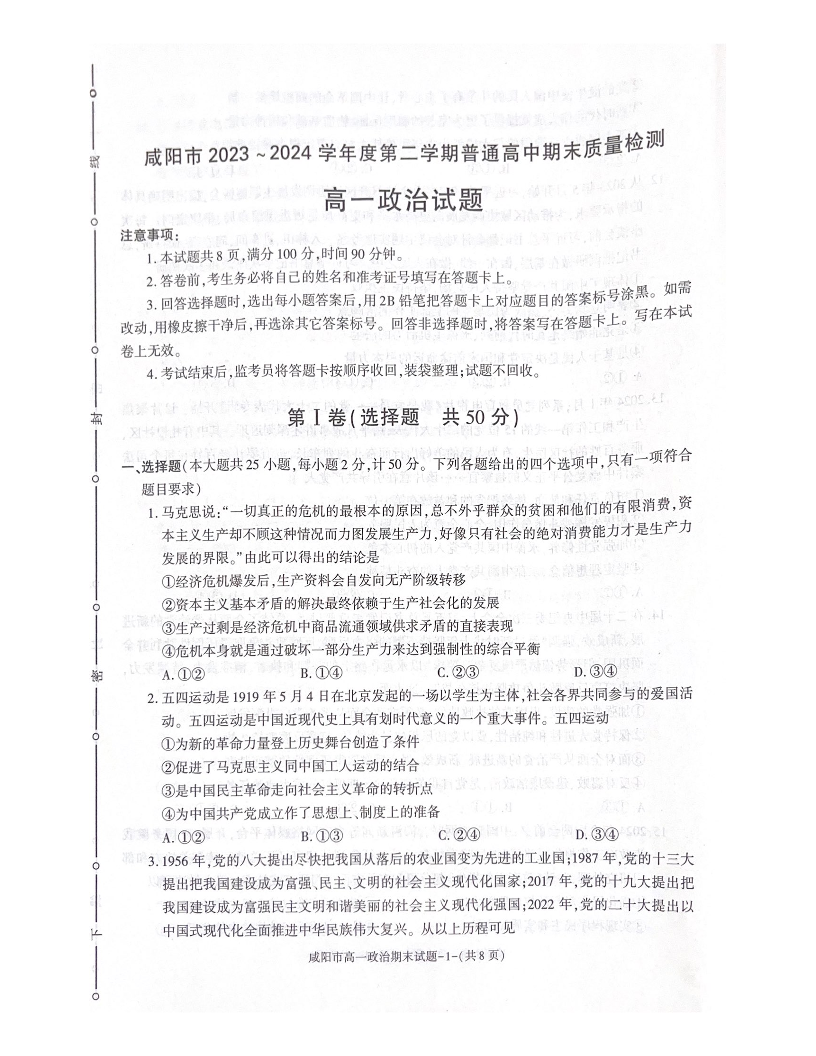 陕西省咸阳市2023-2024学年高一下学期7月期末考试 政治