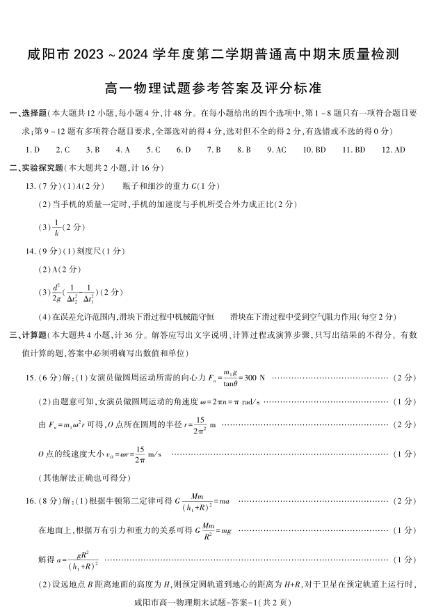 答案—咸阳市高一物理期末