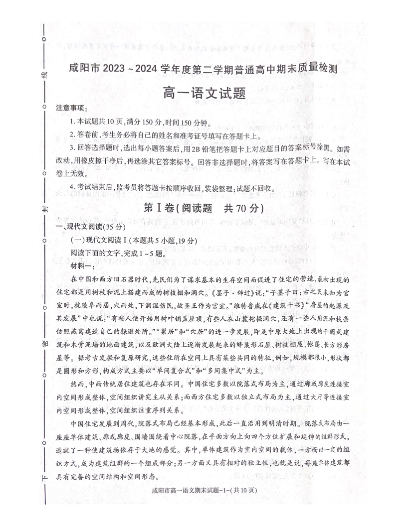 陕西省咸阳市2023-2024学年高一下学期7月期末考试 语文