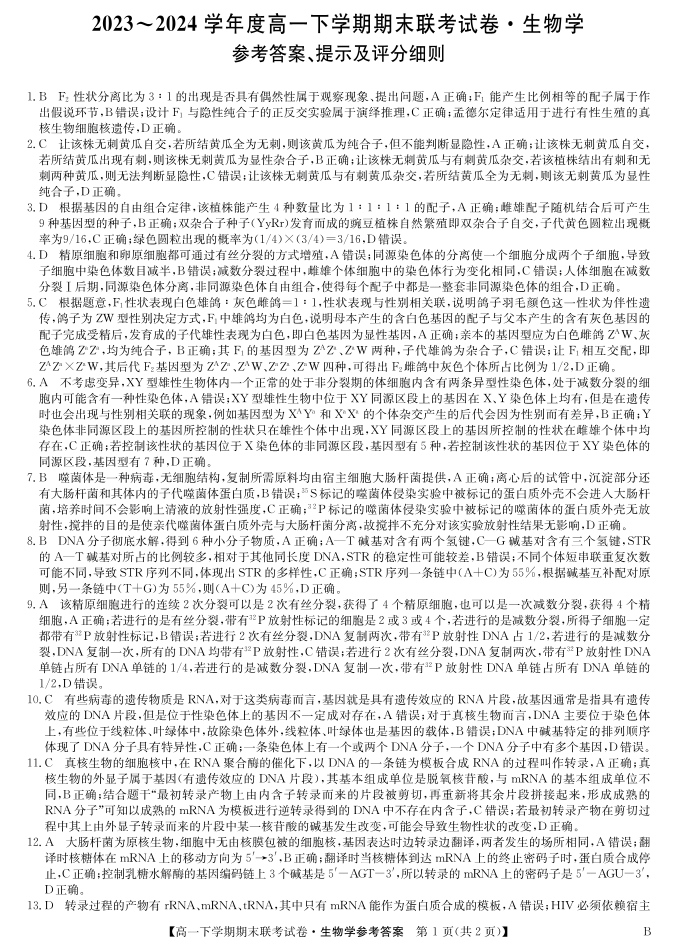 高一生物答案(B版)