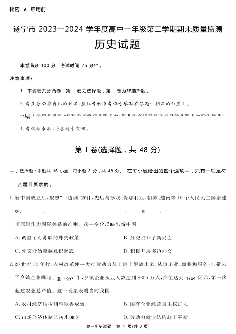 四川省九市2023-2024学年度高一第二学期期期末质量检测联考 历史