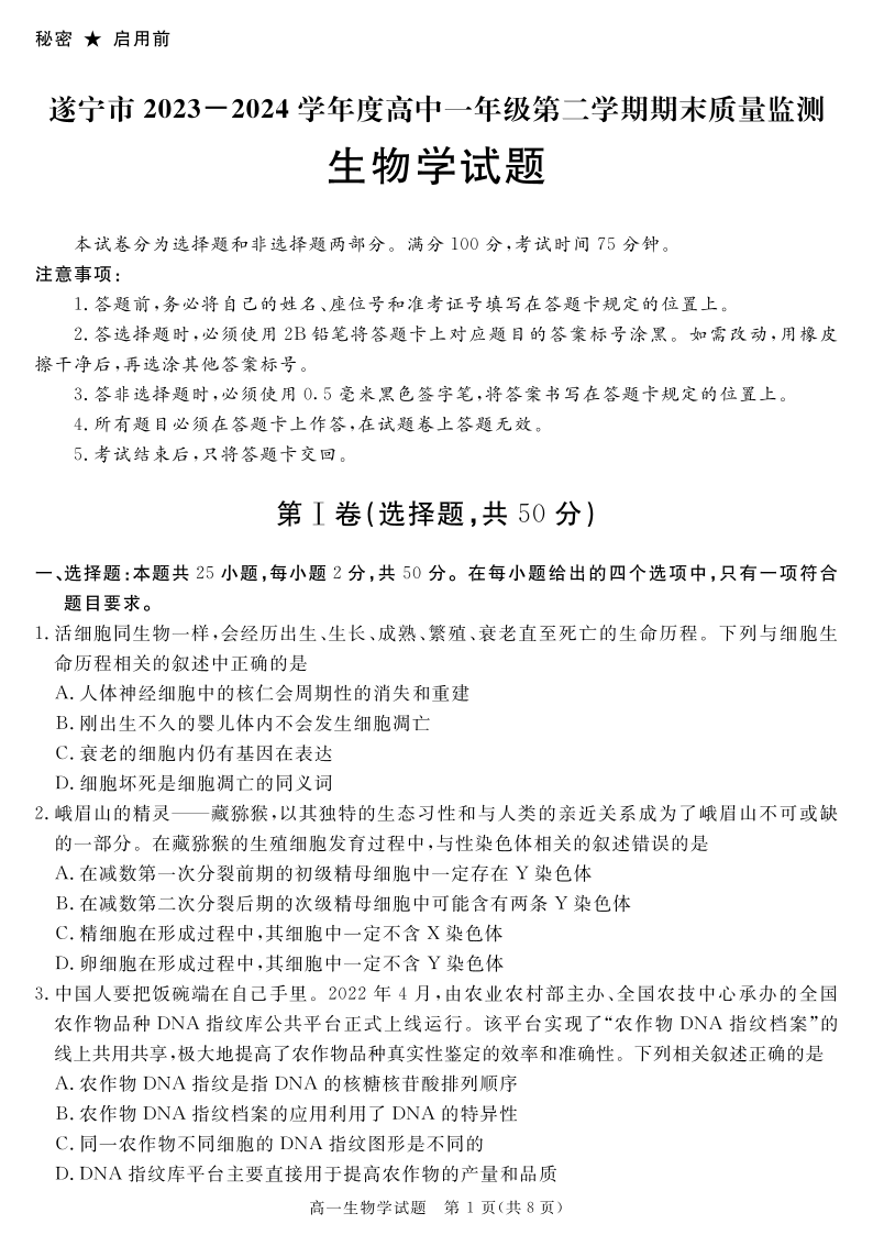 四川省九市2023-2024学年度高一第二学期期期末质量检测联考 生物