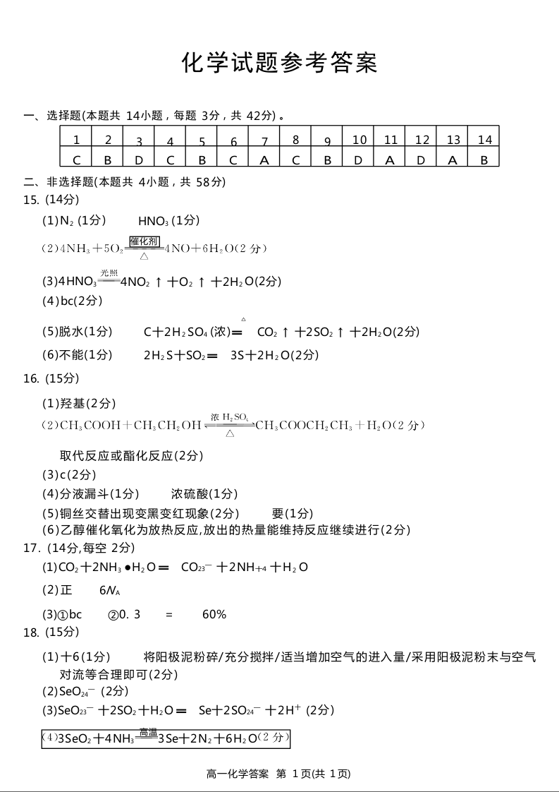 四川省九市2023-2024学年度高一第二学期期期末质量检测联考 化学答案