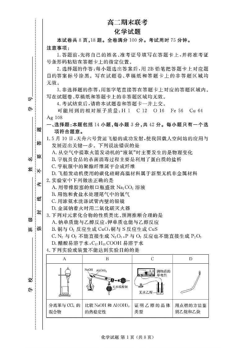 2024年衡水金卷高二年级下学期7月期末联考考试 化学