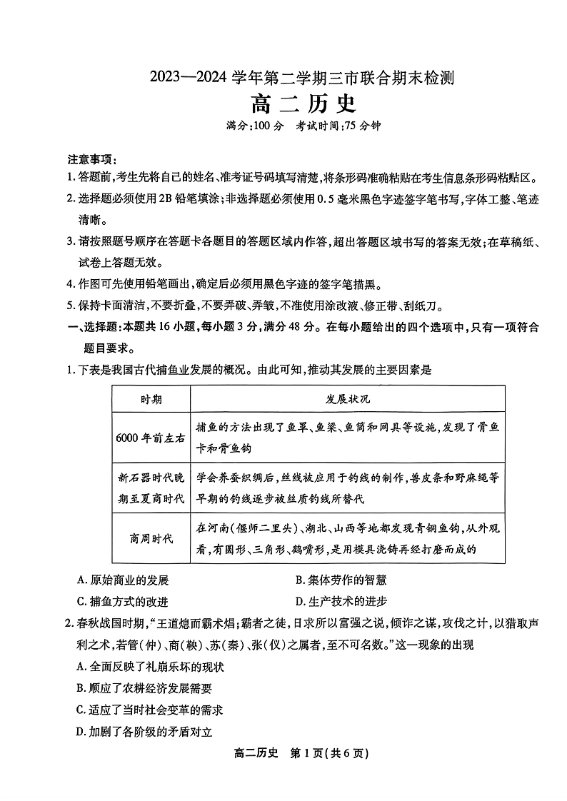 安徽省鼎尖县中联盟2023-2024学年高二下学期7月三市期末联考 历史