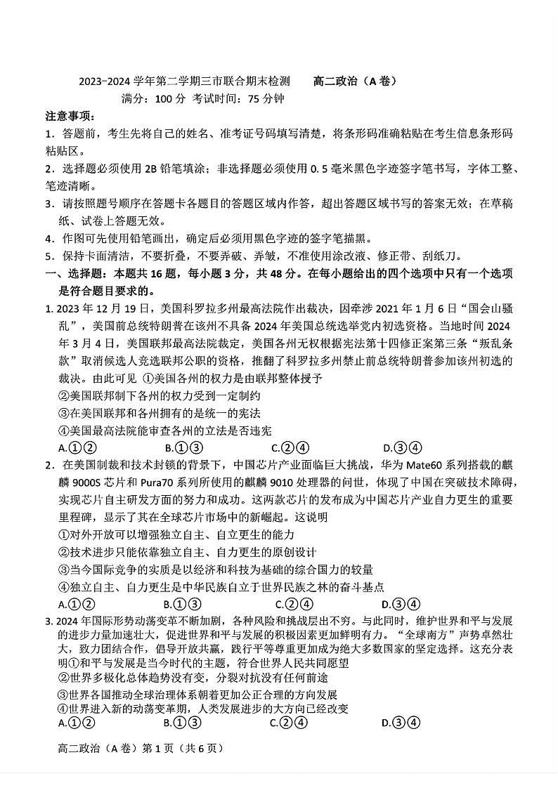 安徽省鼎尖县中联盟2023-2024学年高二下学期7月三市期末联考 政治