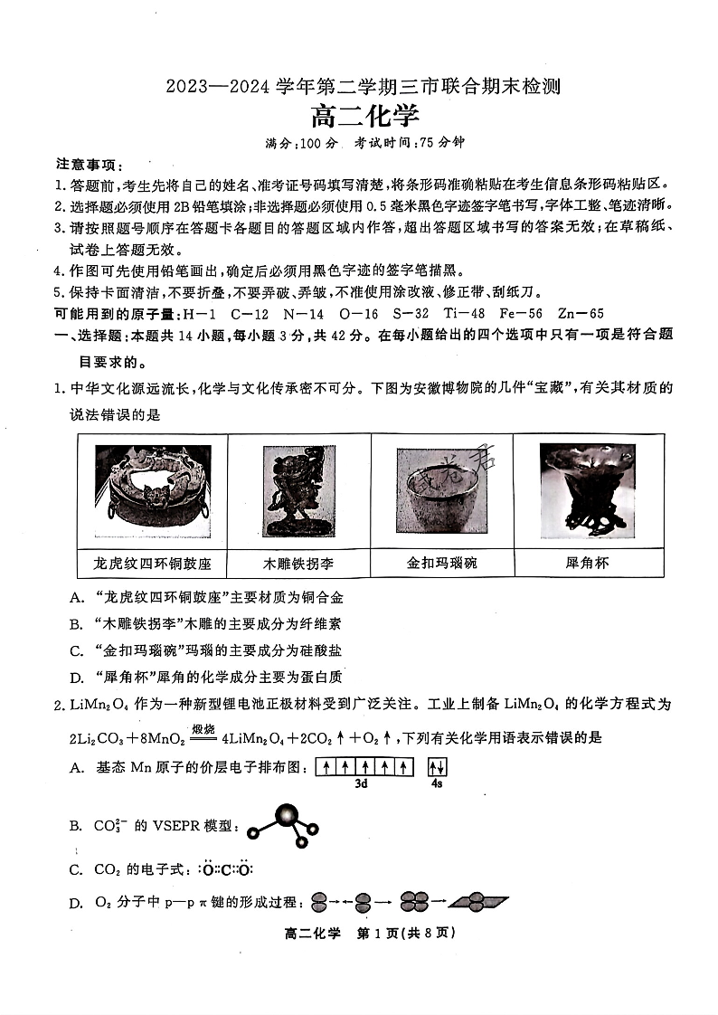 安徽省鼎尖县中联盟2023-2024学年高二下学期7月三市期末联考 化学