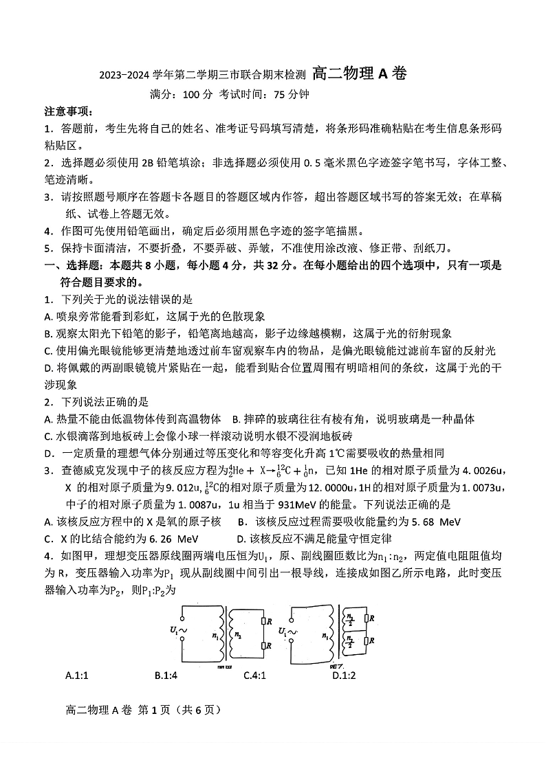安徽省鼎尖县中联盟2023-2024学年高二下学期7月三市期末联考 物理
