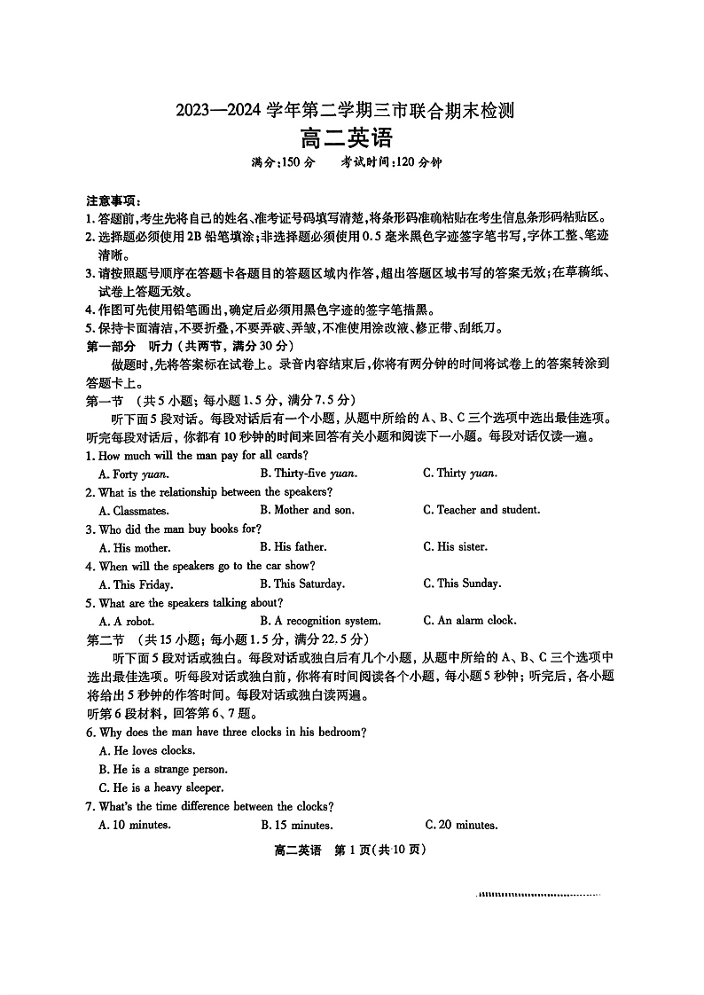 安徽省鼎尖县中联盟2023-2024学年高二下学期7月三市期末联考 英语