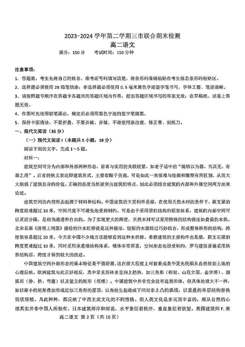 安徽省鼎尖县中联盟2023-2024学年高二下学期7月三市期末联考 语文
