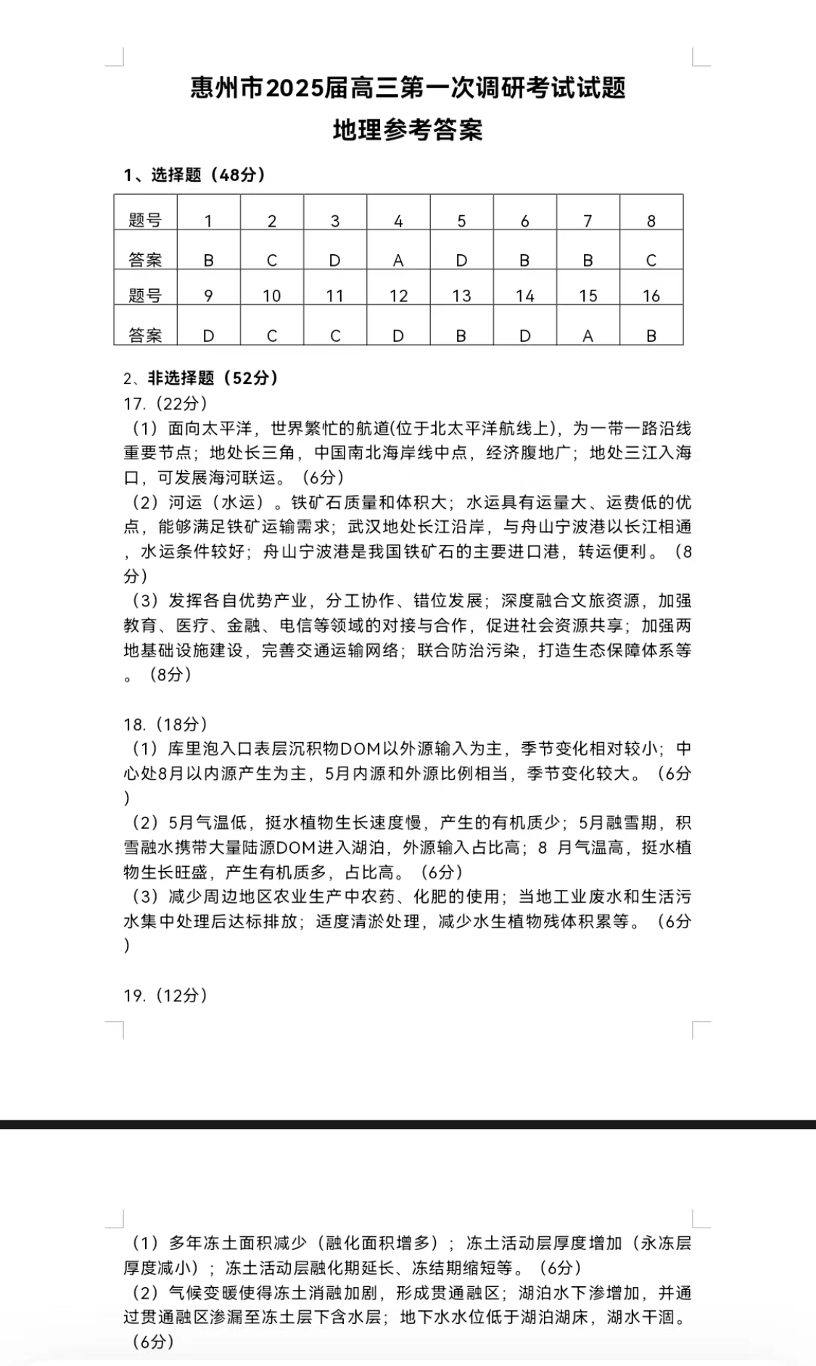 广东省惠州市2025届高三第一次调研考试暨惠州高二期末考试 地理答案