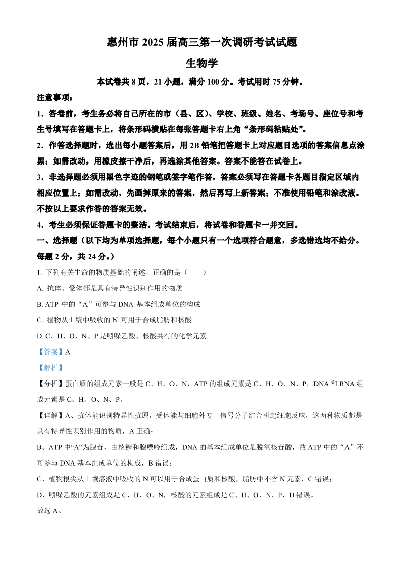 广东省惠州市2025届高三第一次调研考试暨惠州高二期末考试 生物答案