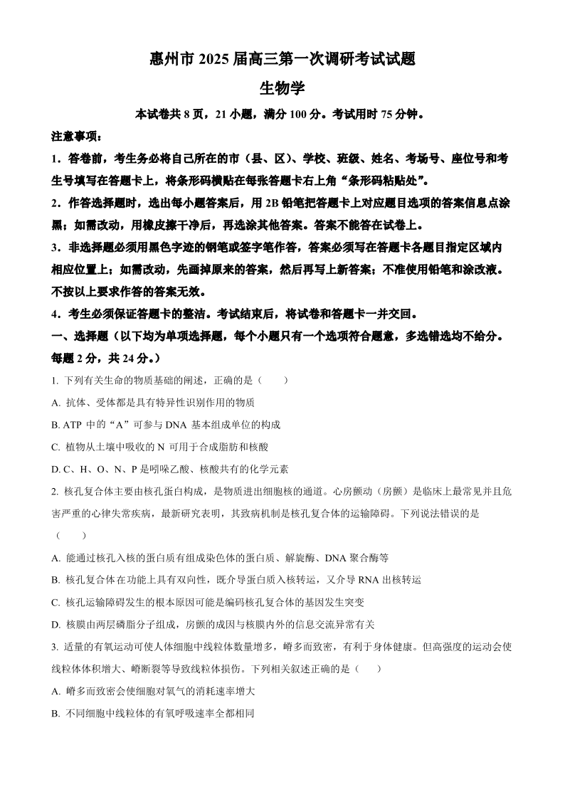 广东省惠州市2025届高三第一次调研考试暨惠州高二期末考试 生物