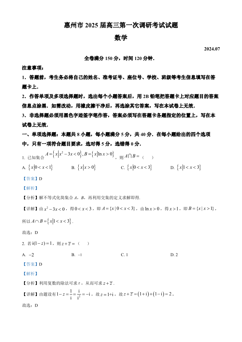 广东省惠州市2025届高三第一次调研考试暨惠州高二期末考试 数学答案