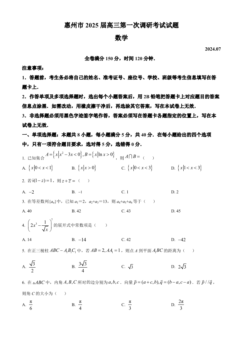 广东省惠州市2025届高三第一次调研考试暨惠州高二期末考试 数学
