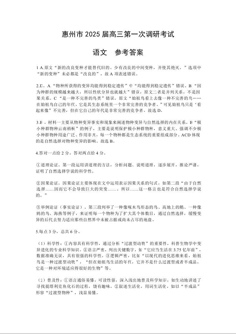 广东省惠州市2025届高三第一次调研考试暨惠州高二期末考试 语文答案