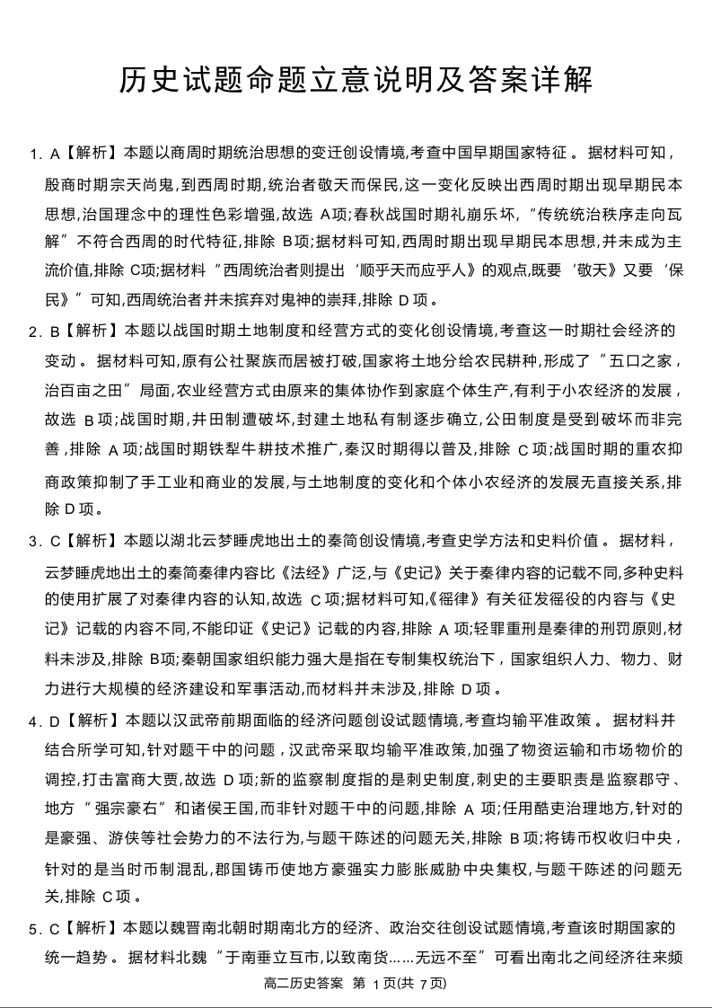 四川省九市2023-2024学年度高二第二学期期期末质量检测联考 历史答案
