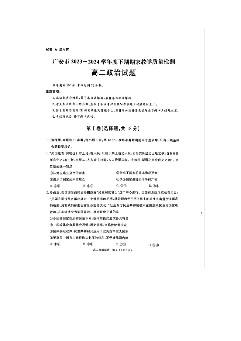 四川省九市2023-2024学年度高二第二学期期期末质量检测联考 政治
