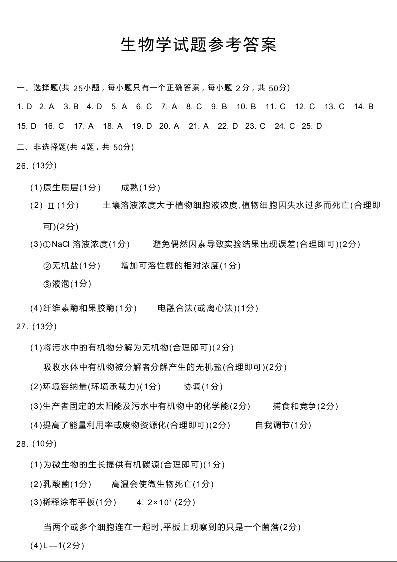 四川省九市2023-2024学年度高二第二学期期期末质量检测联考 生物答案