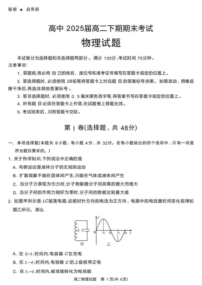 四川省九市2023-2024学年度高二第二学期期期末质量检测联考 物理