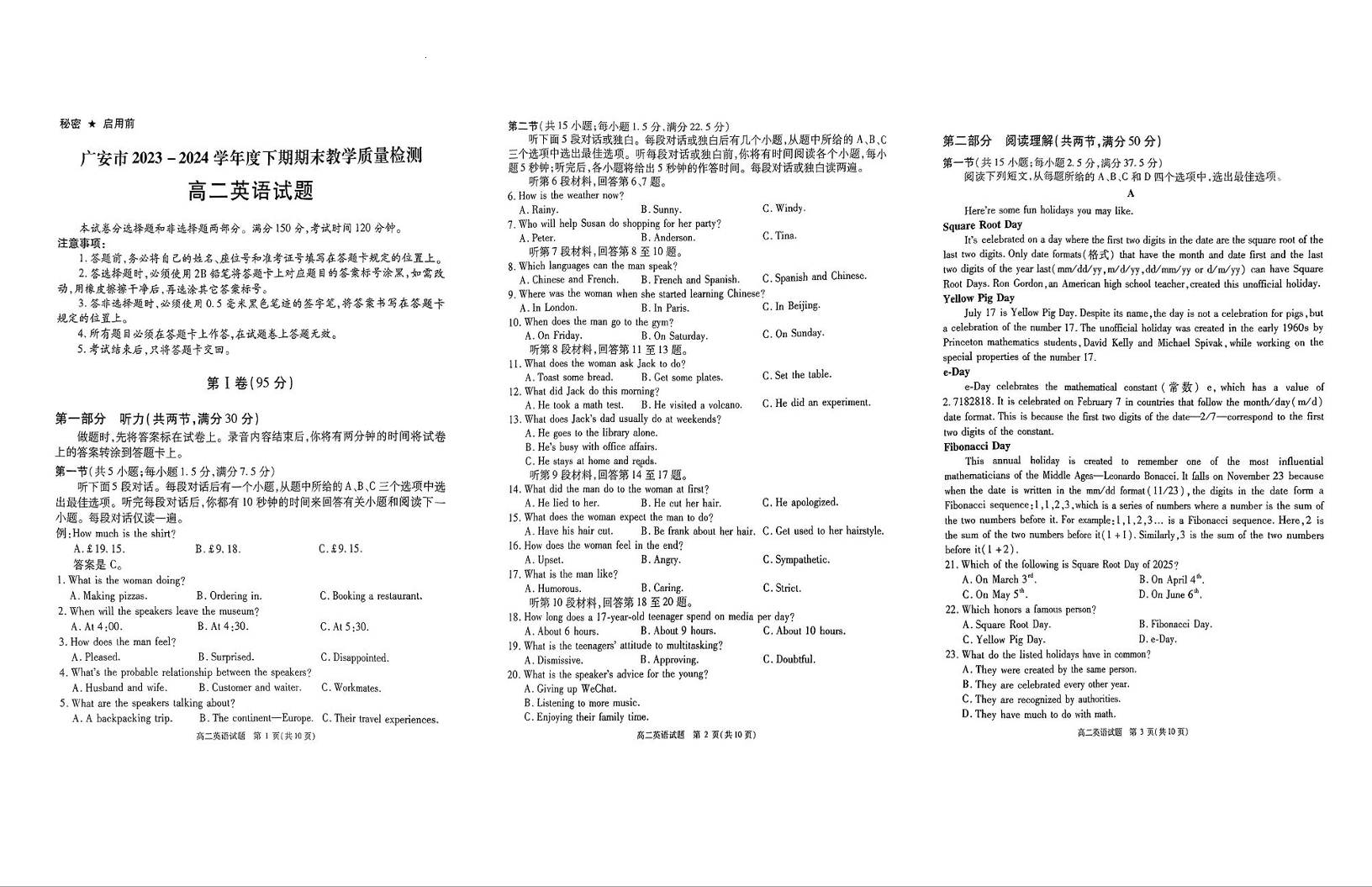 四川省九市2023-2024学年度高二第二学期期期末质量检测联考 英语
