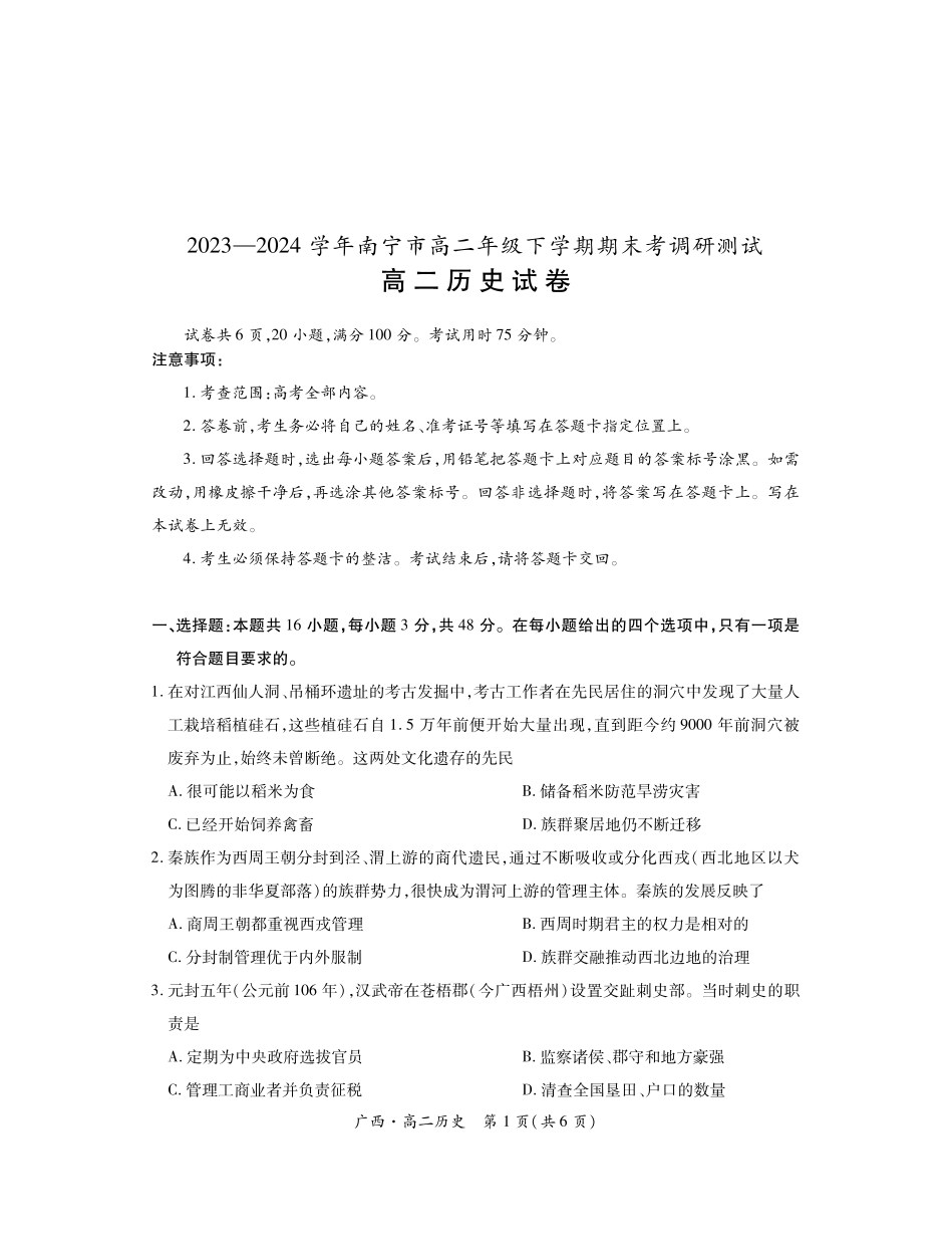 广西壮族自治区2023-2024学年南宁市高二年级下学期期末考试调研测试 历史